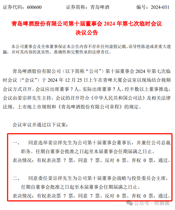 同日公告浮现,青岛啤酒第十届董事会2024年第七次临时会议于12月25日上昼召开,会议审议并通过两份议案。