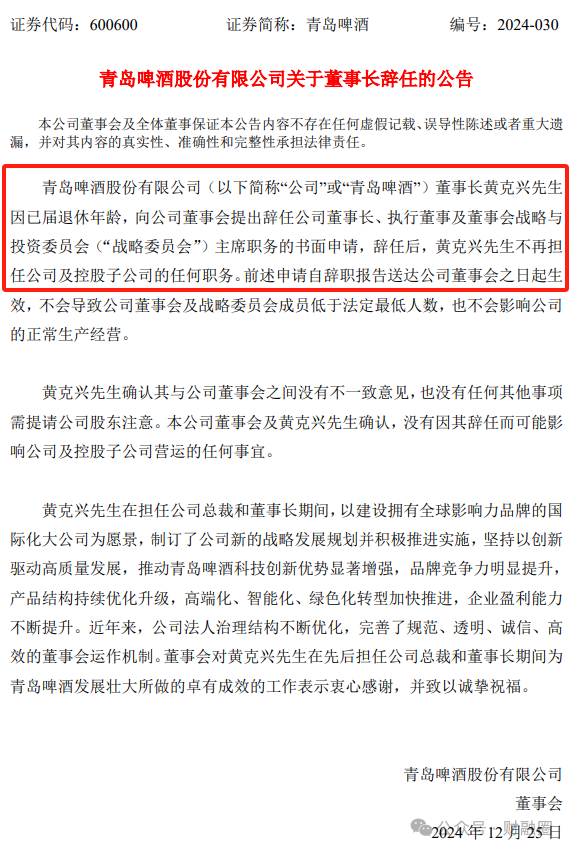 2024年12月25日,上交所主板上市公司青岛啤酒(600600.SH)发布公告称,黄克兴因退休辞任董事长等职务,总裁姜宗祥被选举为公司新任董事长。
