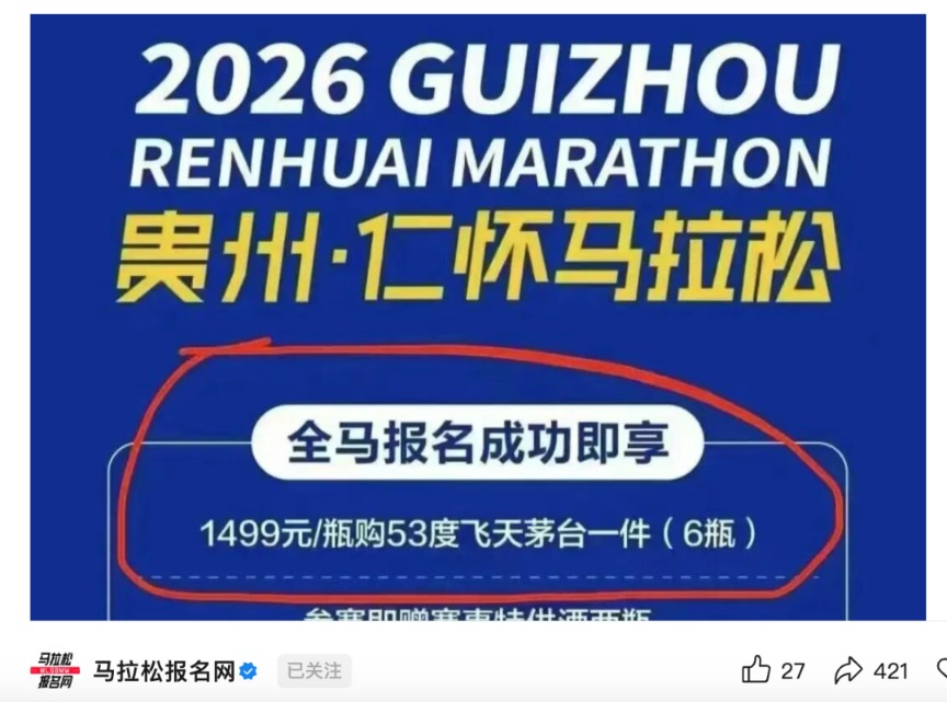 这次马拉松还有一个极具引诱眼球的亮点,据马拉松报名网官微著作,全马报名奏效可享“1499元/瓶购53度飞天茅台一件(6瓶)”。把柄第三方平台报价,3月20日,53度/500ml的散装飞天茅台行情价为1560元,而原箱行情价则为1635元。这意味着,来跑这场马拉松,还有望通过购酒来获取约800元的差价福利。